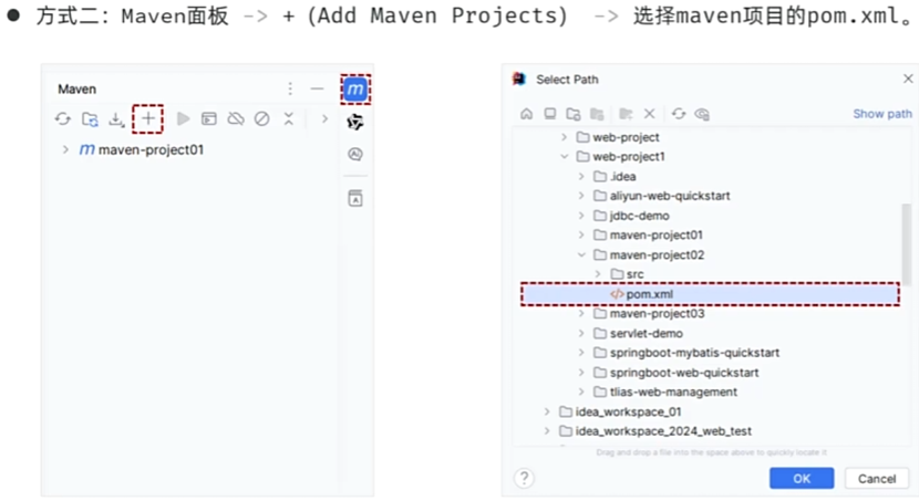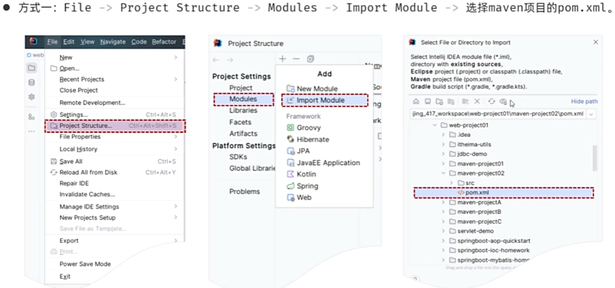先将maven项目的文件夹复制出来,粘贴到目标项目的目录下 。此时文件夹已经在项目目录中显式出来了,但是它并不识别这是一个maven项目,这就需要上图的两种方式来导入了。