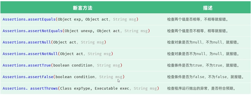 单元测试方法运行不报错,不代表业务方法没问题。Junit提供了一些辅助方法 ,帮我们确定被测试的方法是否按照预期的效果正常工作 ,这种方式称为断言。