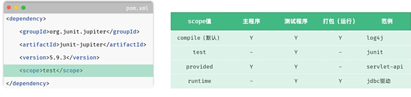 依赖的jar包,默认情况下,可以在任何地方使用 。可以通过**<scope>...</scope>**设置其作用范围。