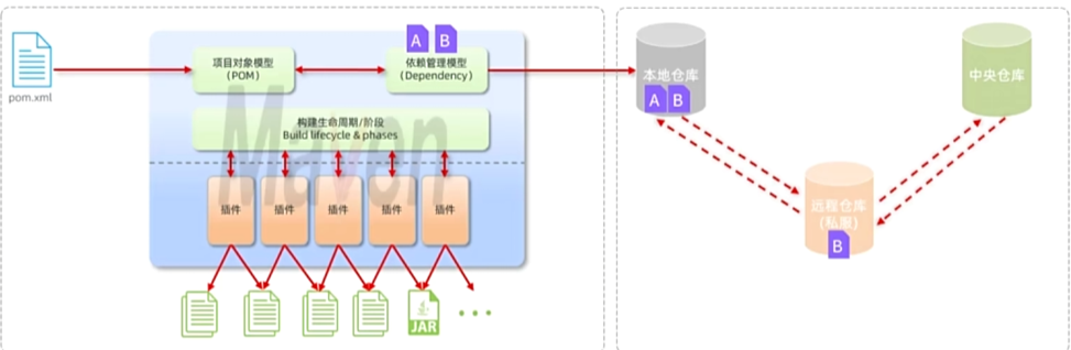 Maven由**项目对象模型(POM)、依赖管理模型(Dependency)、构建生命周期/阶段(Build lifecycle & phases)**三大部分组成。