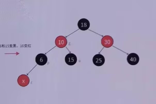 在子树a或b中插入新结点,向上处理更新,X结点由黑更新为红,与双亲结点6的颜色红红冲突,因此需继续向上处理,由于u结点也为红,故处理方式为将p、u变黑,g变红,同理也需观察g的双亲结点是否与g颜色冲突,若冲突,继续向上处理,若g的双亲结点为黑,则处理结束,若g为整棵树的根,则再将g染黑即可。