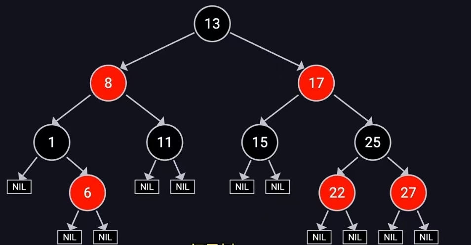 4、对于任意一个结点,从该结点到其所有NIL结点的简单路径上,均包含相同数量的黑色结点,NIL结点指的是空结点,规定NIL结点的颜色为黑色。
