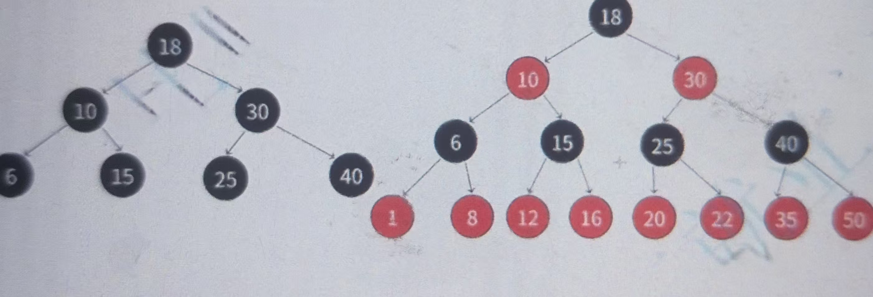 红黑树为平衡二叉搜索树,红黑树的结点增加了一个存储位来表示结点的颜色,可以是红色或黑色,红黑树通过对任何一条从根到叶子的路径上各个结点的颜色进行约束,确保没有一条路径会比其他路径长出2倍,因此红黑树是接近平衡的。