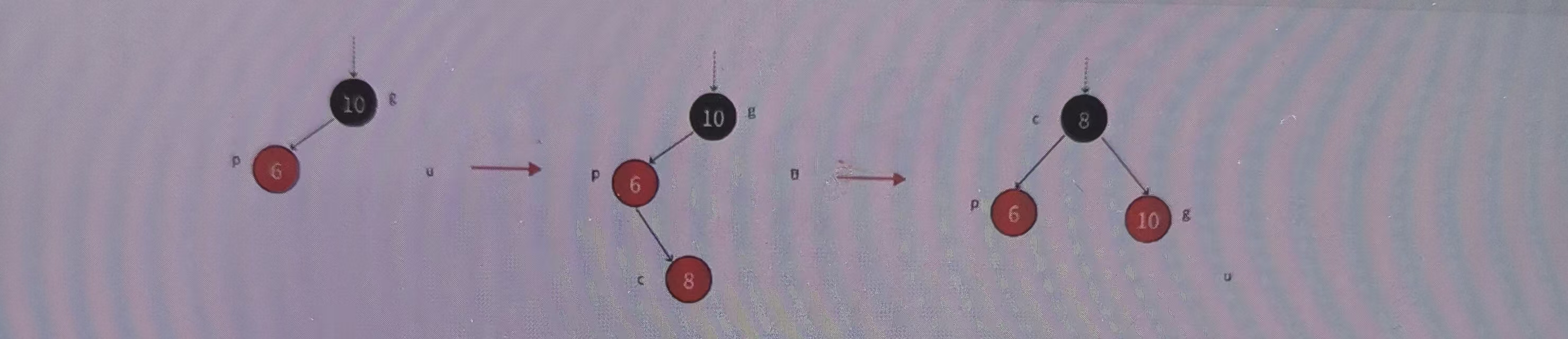 在结点8的子树中插入新结点,结点8的颜色由黑更新为红,与结点6的颜色红红冲突,u结点颜色为黑,处理方法与上面类似,先以p为旋转点进行左单旋,a变为p的右子树,p变为8的左子树,再以g为旋转点进行右单旋,b变为10的左子树,10变为8的右子树,左右双旋后c变为新的根,再将c染黑,g染红,这样左右双旋变色后,以c为根的子树黑色结点数量不变,同时也解决了连续的红色结点问题,c的双亲结点颜色为黑为红为空都不与c冲突,不需要继续向上更新,处理结束。