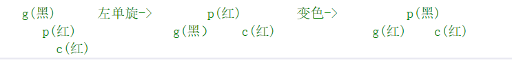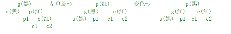 先以g为旋转点进行左单旋,p变为新的根,再将p染黑,g染红即可,左单旋变色后以p为根的子树不违反红黑树的规则,处理结束。