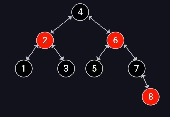 3、如果一个结点为红色,则它的两个孩子结点只能为黑色,即任意一条路径不会有连续的红色结点。