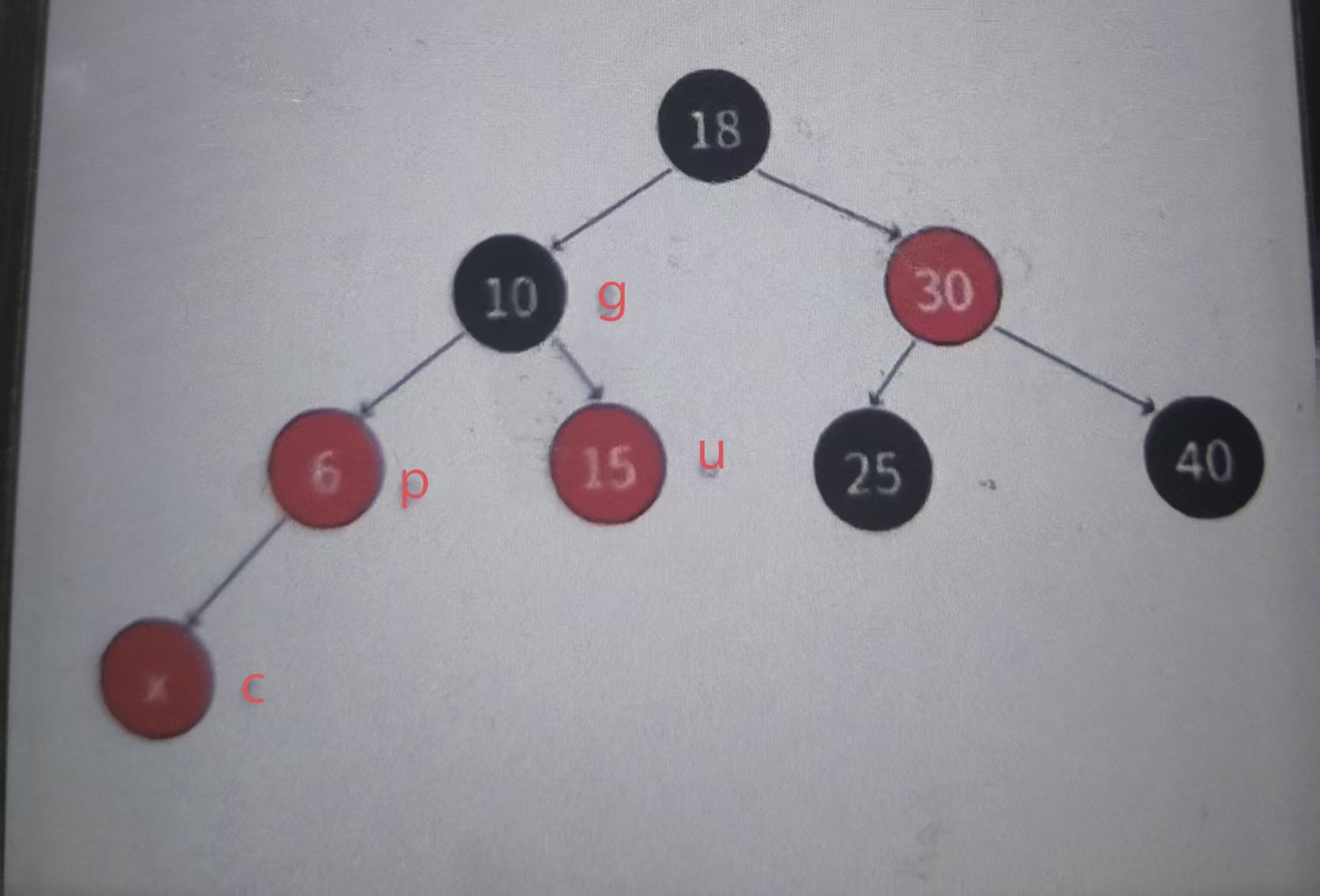 若parent为红色结点,如下图所示,为方便分析,将新增结点标识为c,c的父亲结点标识为p,p的父亲结点标识为g,p的兄弟结点标识为u。