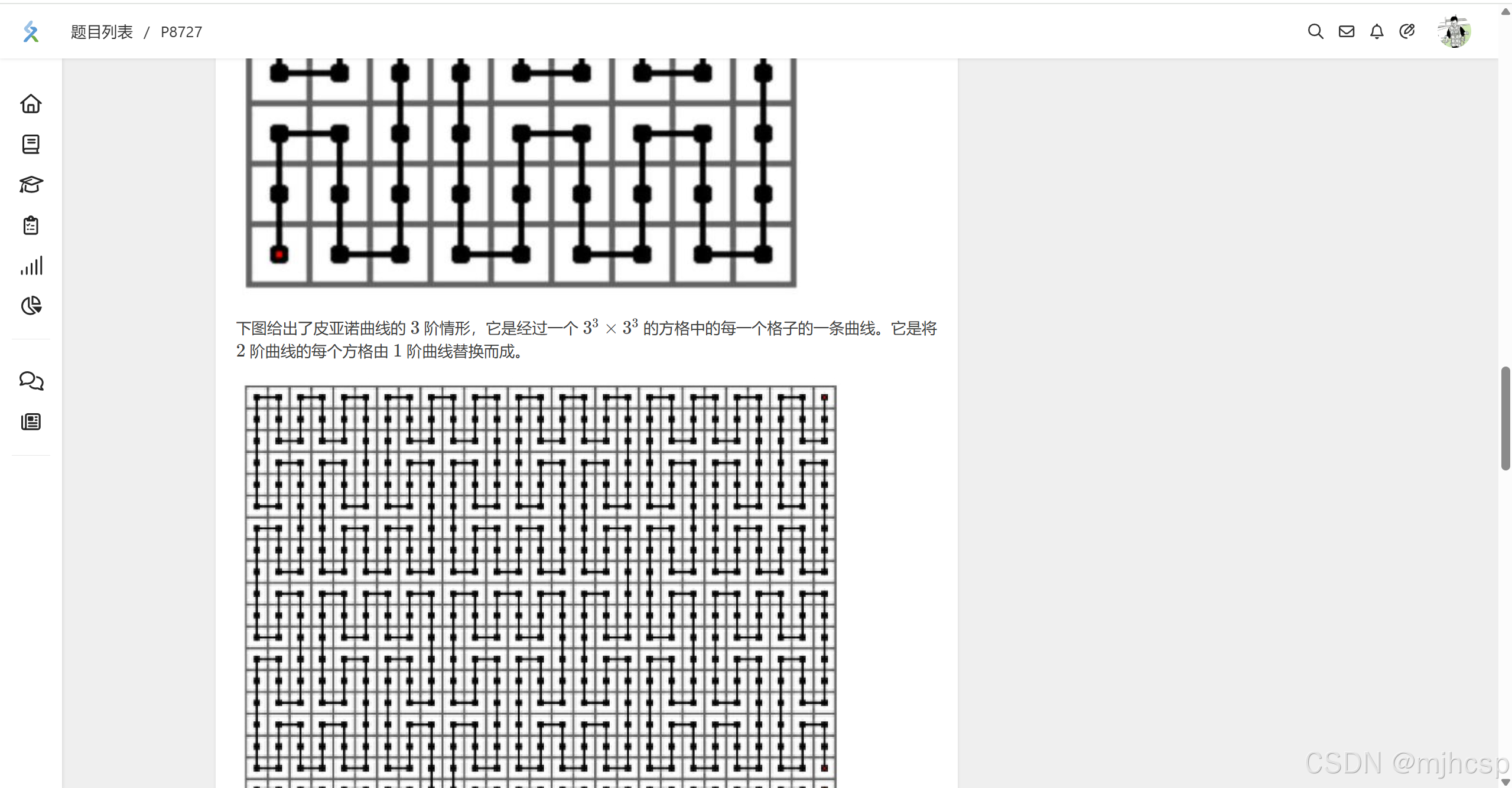 下图给出了皮亚诺曲线的 3 3 3 阶情形,它是经过一个 3 3 × 3 3 3^{3} \times 3^{3} 33×33 的方格中的每一个格子的一条曲线。它是将 2 2 2 阶曲线的每个方格由 1 1 1 阶曲线替换而成。