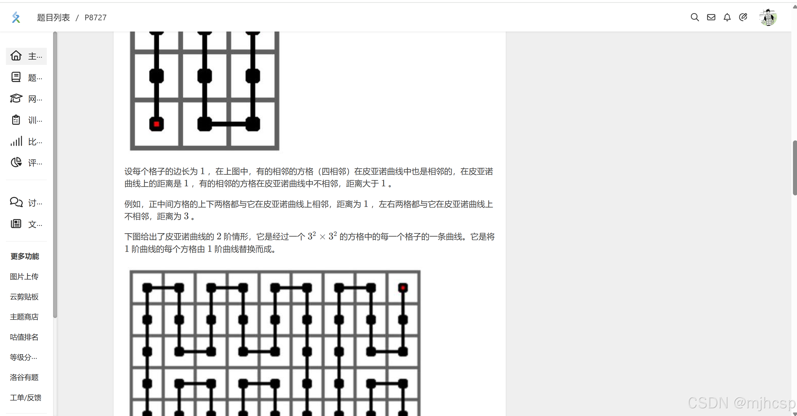 设每个格子的边长为 1 1 1 ,在上图中,有的相邻的方格(四相邻)在皮亚诺曲线中也是相邻的,在皮亚诺曲线上的距离是 1 1 1 ,有的相邻的方格在皮亚诺曲线中不相邻,距离大于 1 1 1 。
