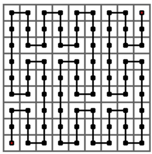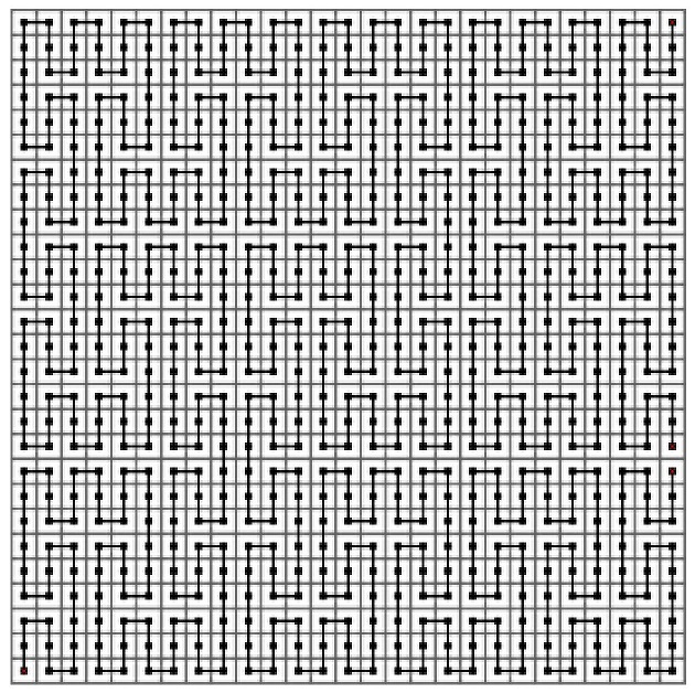 下图给出了皮亚诺曲线的 2 2 2 阶情形,它是经过一个 3 2 × 3 2 3^{2} \times 3^{2} 32×32 的方格中的每一个格子的一条曲线。它是将 1 1 1 阶曲线的每个方格由 1 1 1 阶曲线替换而成。