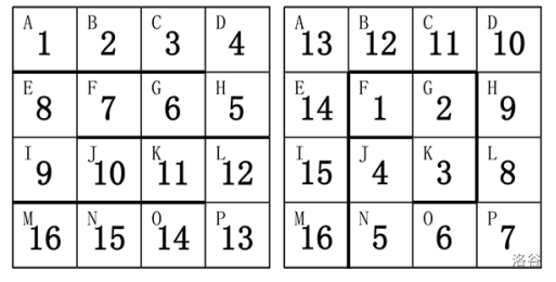 小蓝还有一个 4 × 4 4 \times 4 4×4 的方格盒子,用于存放玩具蛇,盒子的方格上依次标着字母 A \mathrm{A} A 到 P \mathrm{P} P 共 16 16 16 个字母。