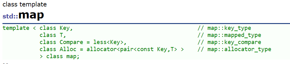 - Compare: 比较器的类型,map中的元素是按照key来比较的,缺省情况下按照小于来比 较,一般情况下(内置类型元素)该参数不需要传递,如果无法比较时(自定义类型),需要用户 自己显式传递比较规则(一般情况下按照函数指针或者仿函数来传递)
