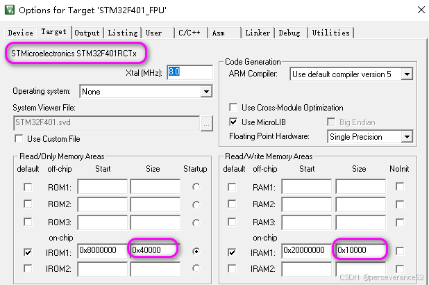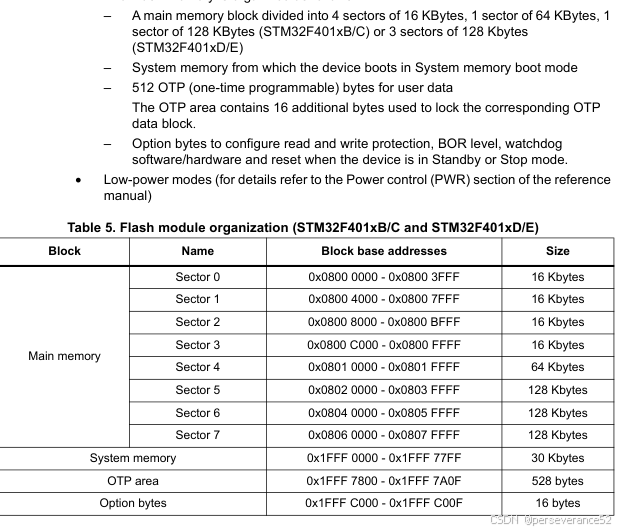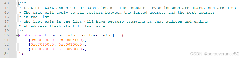 MCU型号STM32F401RC,flash是256KB为例,前4个扇区是16KB,第五个扇区是64KB,第六个扇区是128KB,总共加起来就是256KB,具体的填写如下: