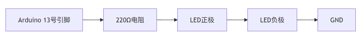 将LED的正极(长脚)通过220Ω电阻连接到Arduino的13号数字引脚,负极(短脚)连接到GND(地线)。以下是电路连接示意图: