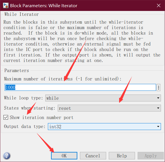 当number of iterators达到1000时也可以退出while语句,这个参数就是为了避免无限循环。双击 While Iterator模块,打开其参数对话框如图所示。