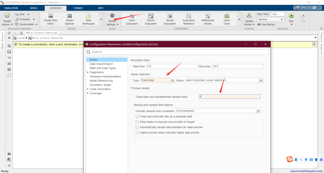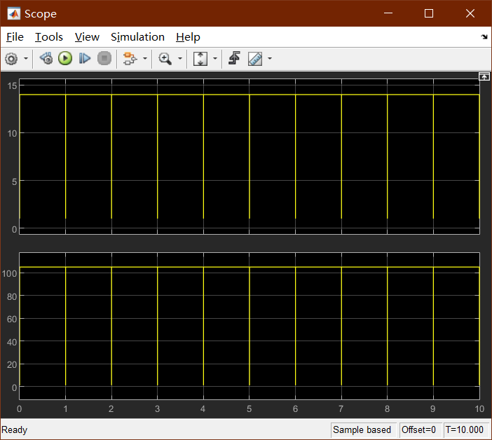 探究运行过程,将仿真设置为固定步长,采样时间设置为1s。