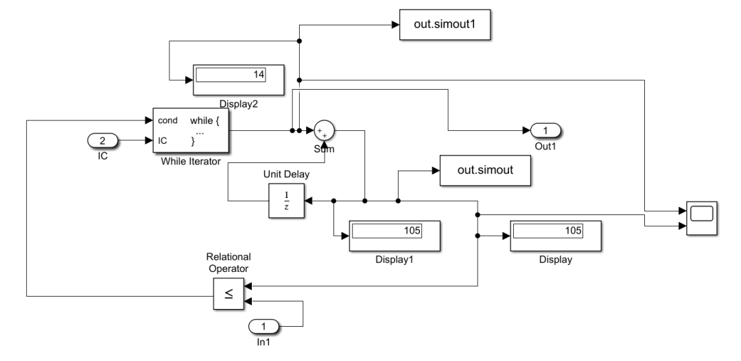 数小于设定的最大循环次数,循环执行一次 out1输出2 Unit Delay 输出0+1(上一次迭代时的