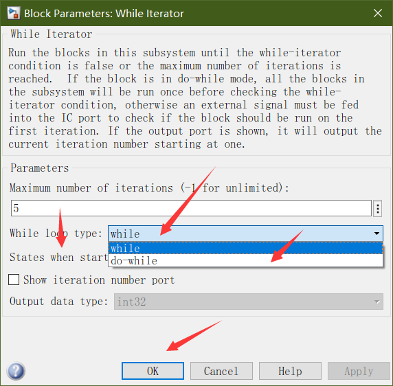 可以用While Iterator模块执行类似C语言的while或do-while循环,它是While子系统内部的控制器模块,在 while loop type设置不同选项时端口输入个数不同,框图如图所示。通过While Iterator模块对话框中的 While loop type可以选择不同的循环类型,如图所示。