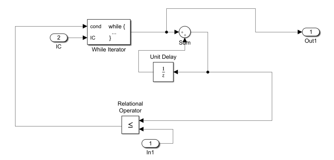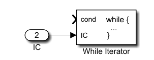 现举例说明while子系统具体用法:设置While loop type为 while时,为了使第一次可以进人while执行,使输入IC为真,子系统每个采样步长内完成特定迭代次数,模型如图所示。
