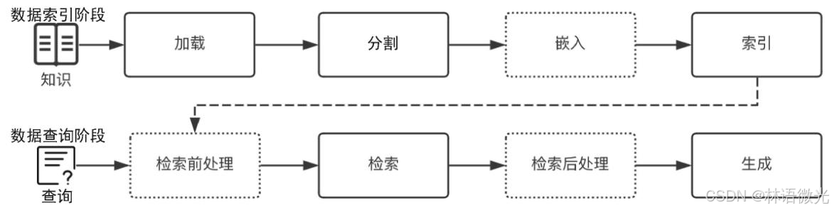 通常可以把开发一个简单的RAG 应用从整体上分为**数据索引 (Indexing)与 数据查询(Query)**两个大的阶段,在每个阶段都包含不同的处理阶段。