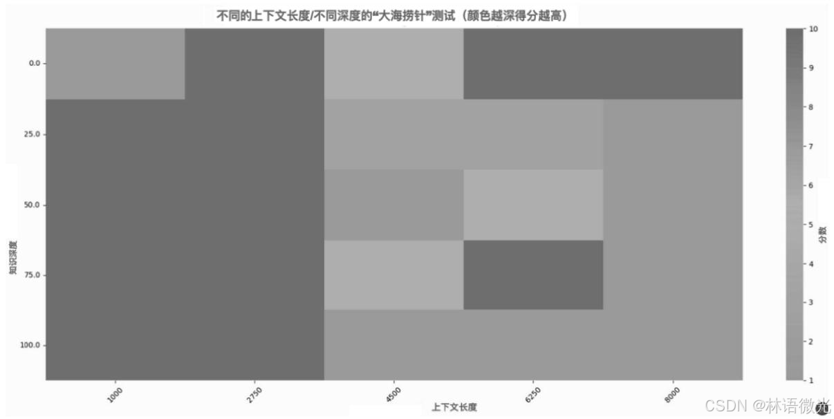 检索精度与上下文长度强相关:图中不同颜色/深度代表不同得分(颜色越深得分越高),能直观看到------当输入上下文长度不同(如2K token vs 128K token)时,大模型精准检索目标知识的得分差异显著,并非上下文越长检索越精准,长上下文场景下精度可能下降。