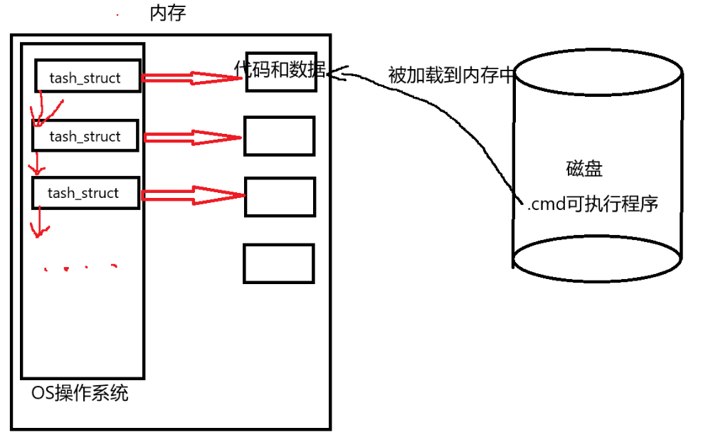 计算机执行程序时,必须通过CPU和内存协同工作。首先,磁盘中的可执行程序代码和数据会被加载到内存中。操作系统会创建task_struct(进程控制块)结构体,用于存储进程的所有属性信息,该结构体包含指向进程所需代码和数据的指针。同时,结构体还维护着指向下一个进程节点的指针。值得注意的是,操作系统本身是一个具有最高优先级的特殊进程,它负责管理其他所有进程,因此总是最先被加载到内存中运行。一个进程=进程PCB+自己的代码和数据。