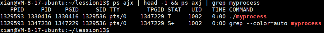 ps ajx | head -1 && ps axj | grep myprocess