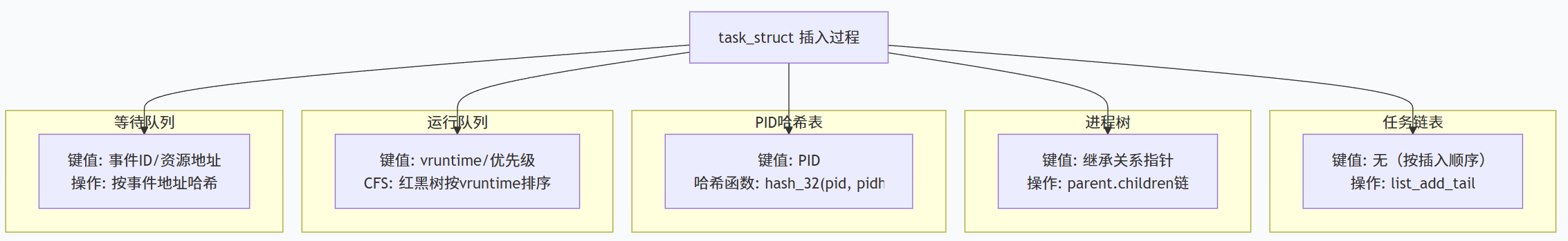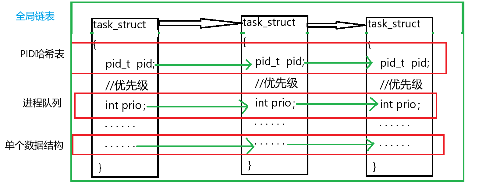 操作系统依据不同的键值将全局链表放到不同的数据结构中,方便完成不同的功能