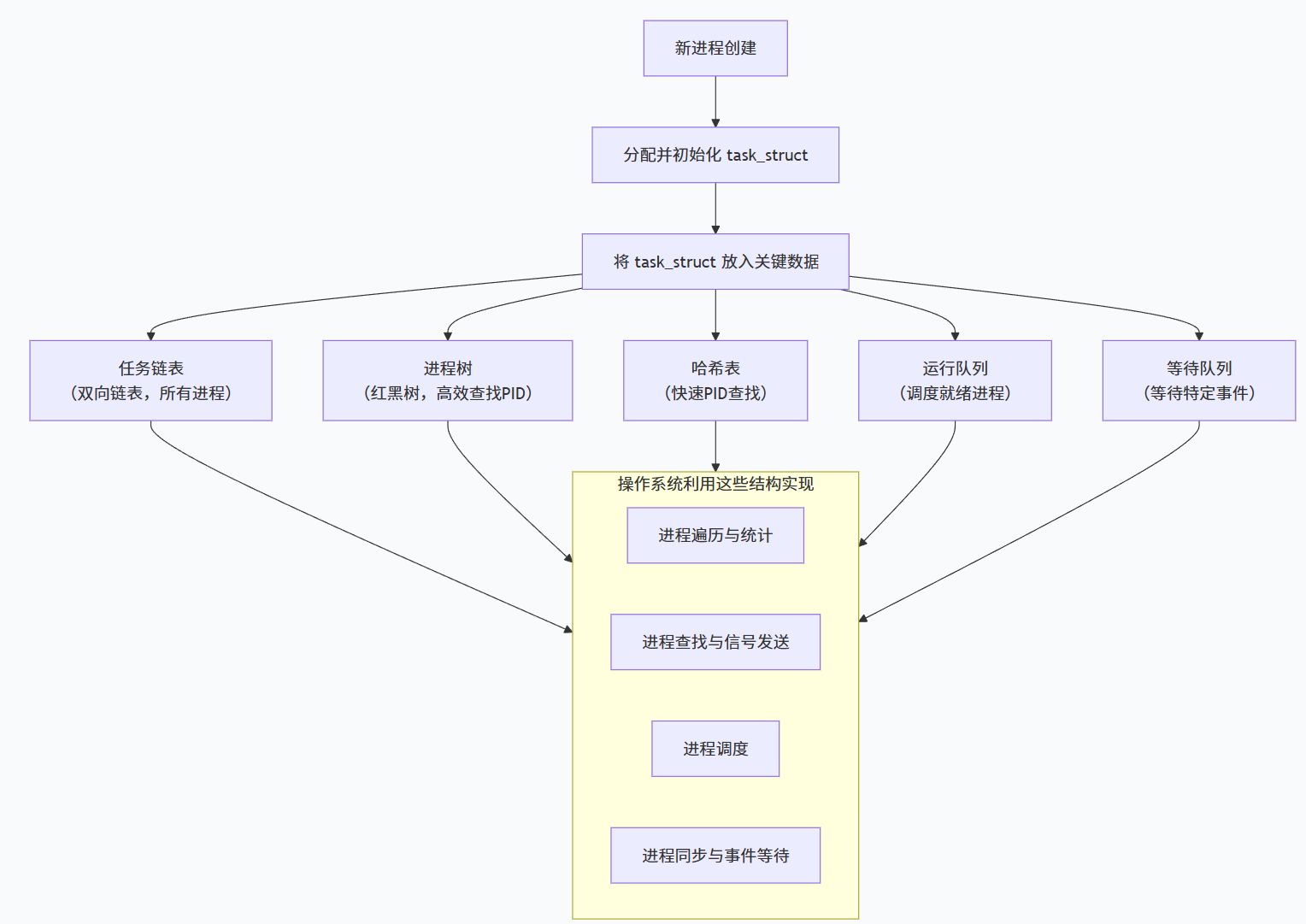 当一个进程诞生时,操作系统会自动为其初始化task_struct结构体。这个结构体中的数据会被放到多个数据结构中。