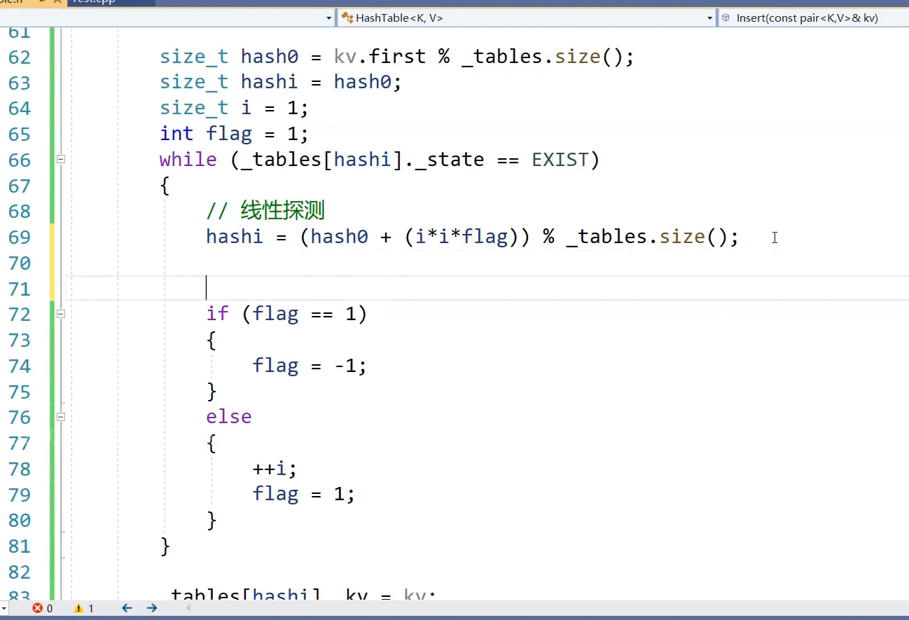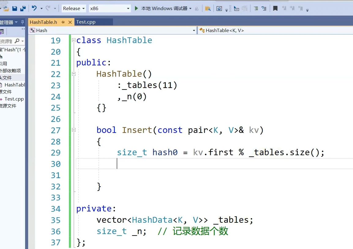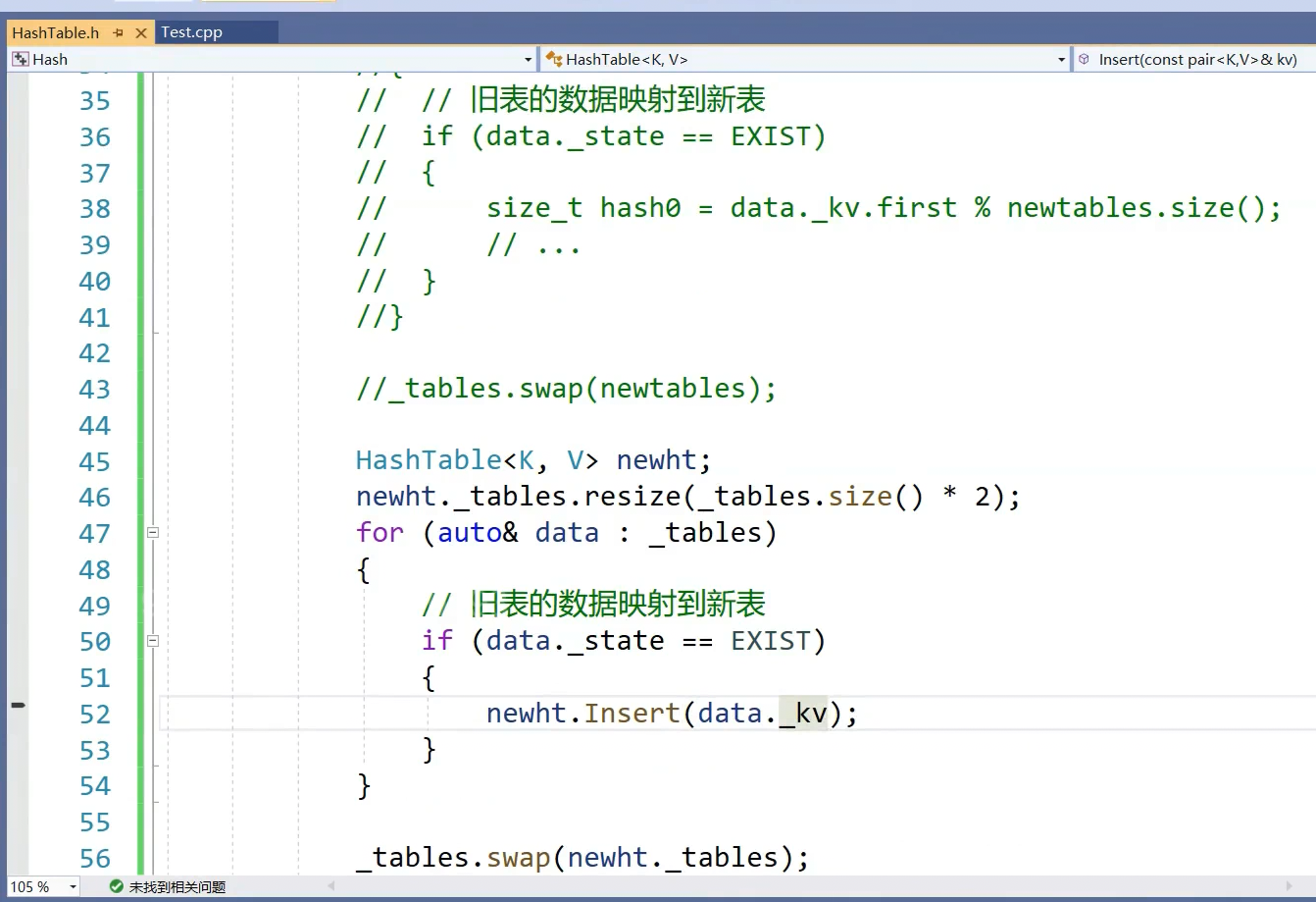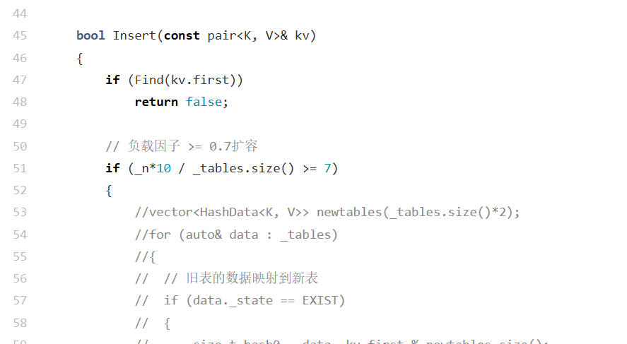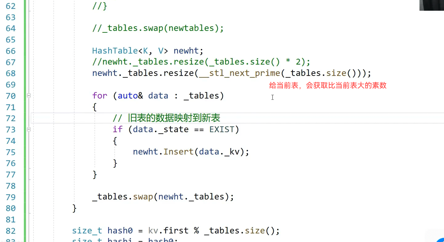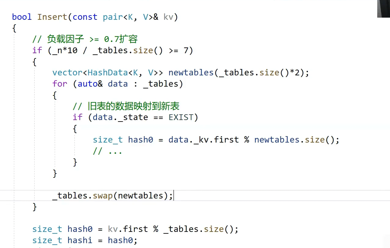 如果搞新vector要自己计算位置,搞新哈希表,把里面vector扩到二倍,遍历旧表,把旧表数据insert到新表,不会再次扩容,因为已经扩了二倍了,负载因子最多0.3到不了扩容,就复用了这个逻辑。