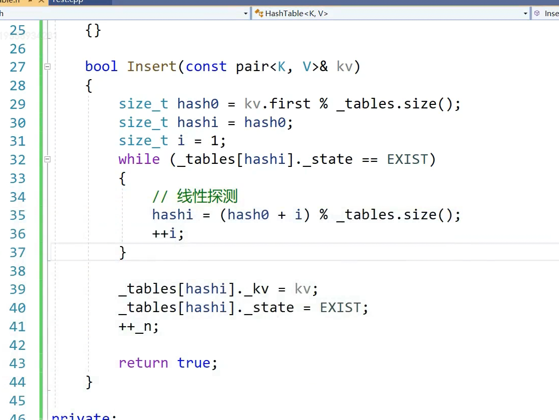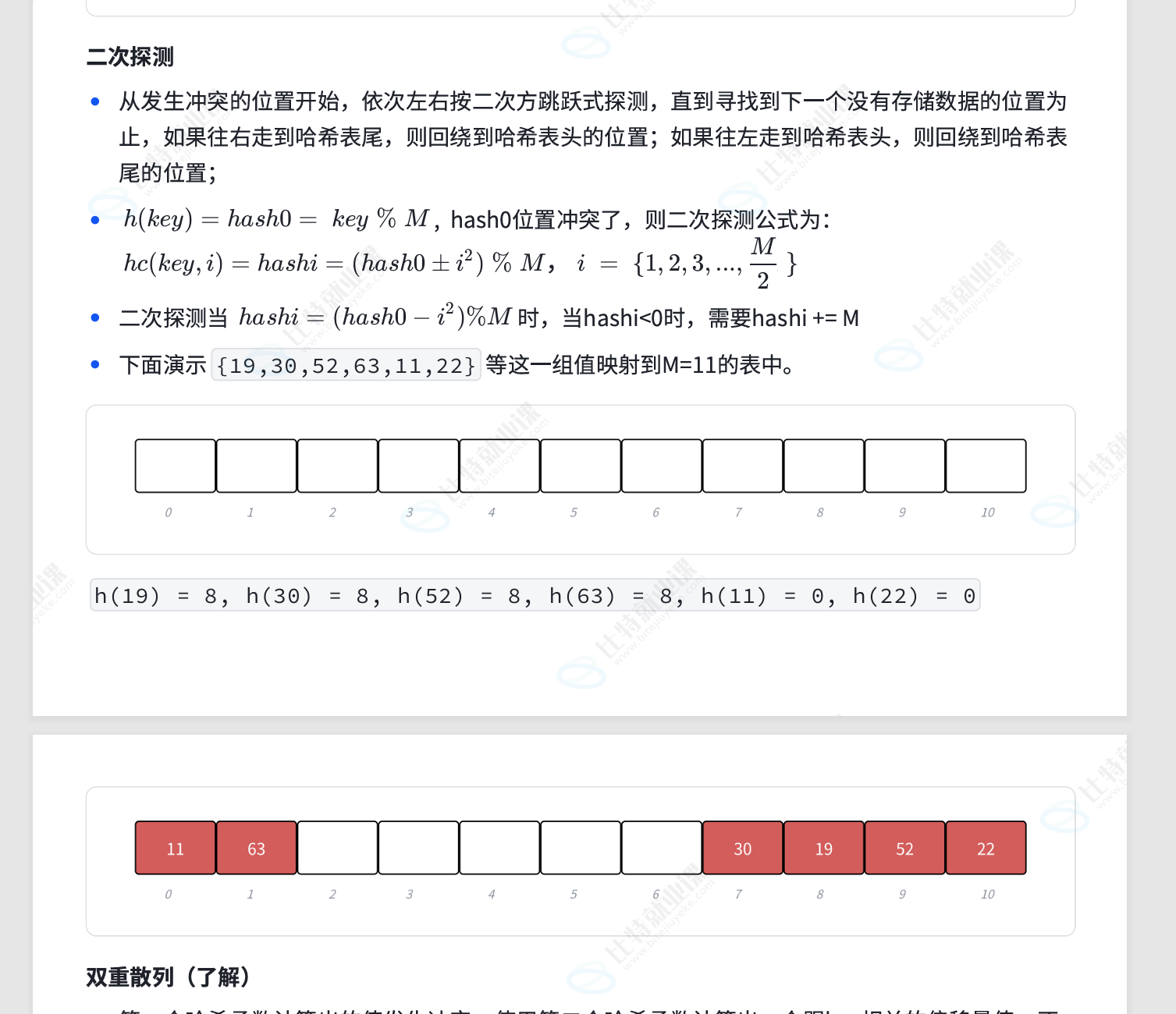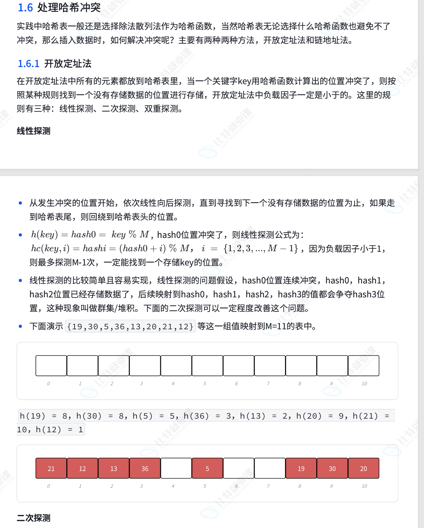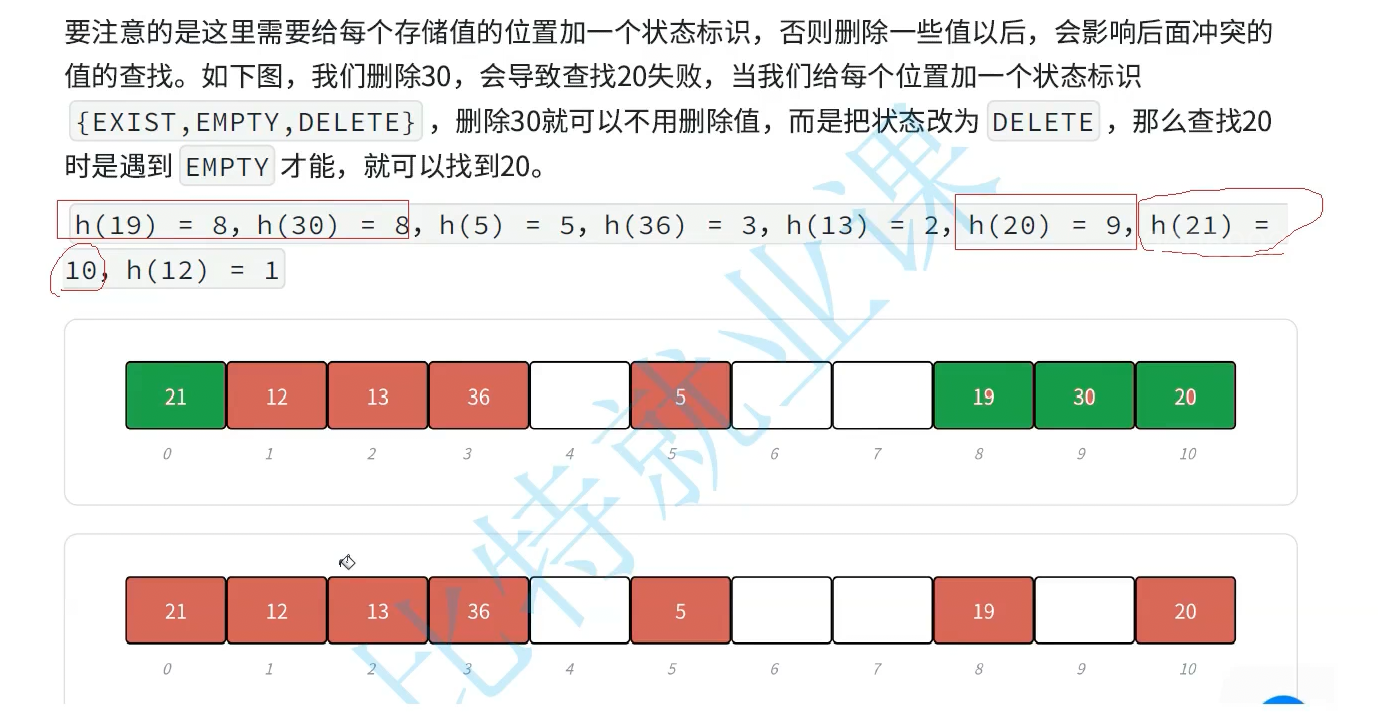 这几个值互相抢位置,比如说找20,在模10位置找,找不到下一个位置找。直到空停止,但是如果删除30,再去查找20,9位置没值,直接停了。这还有三个枚举值存在 空 删除,删除了,标记成删除,删除状态继续往后找。哈希冲突越多效率越低。
