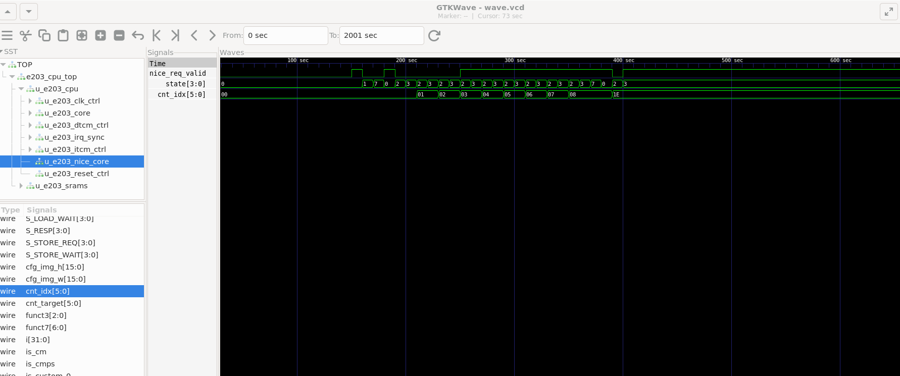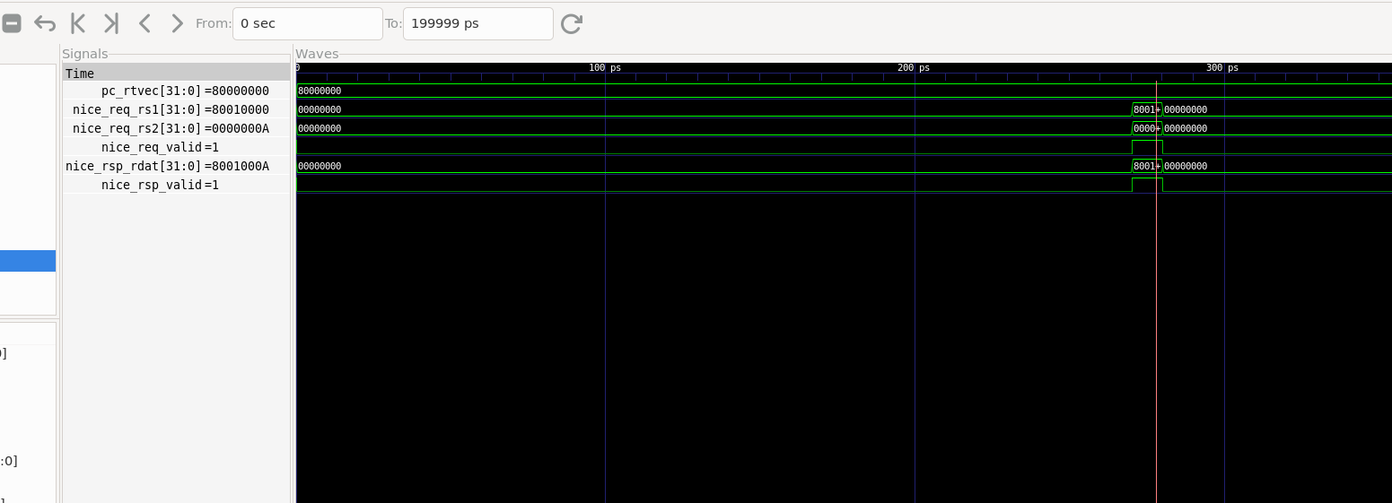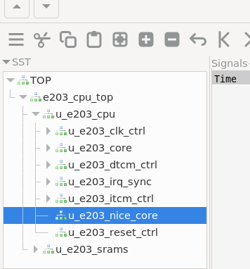 可以看到波形TOP -> e203_cpu_top -> u_e203_subsys_top -> u_e203_subsys_main -> u_e203_subsys_perips -> u_e203_subsys_nice_core中的: