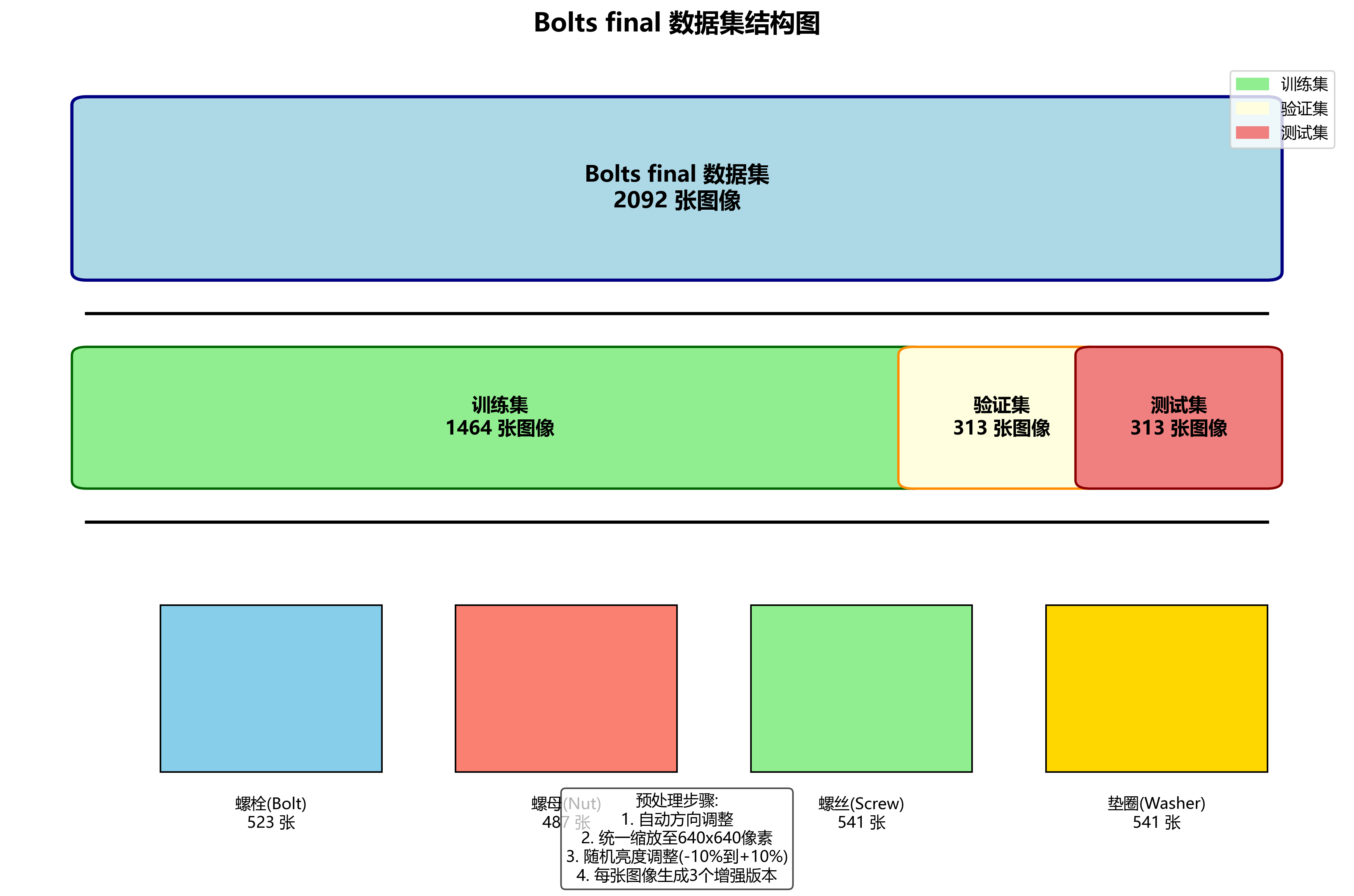 数据集的构建过程充分考虑了实际应用场景的多样性,包括不同品牌、不同规格的紧固件,以及各种拍摄角度和光照条件。在数据标注过程中,我们采用了半自动标注方式,先使用预训练模型进行初步标注,再由人工进行修正,既提高了标注效率,又保证了标注质量。这种数据构建方法在工业应用中被证明是有效的,能够显著提高模型的泛化能力。