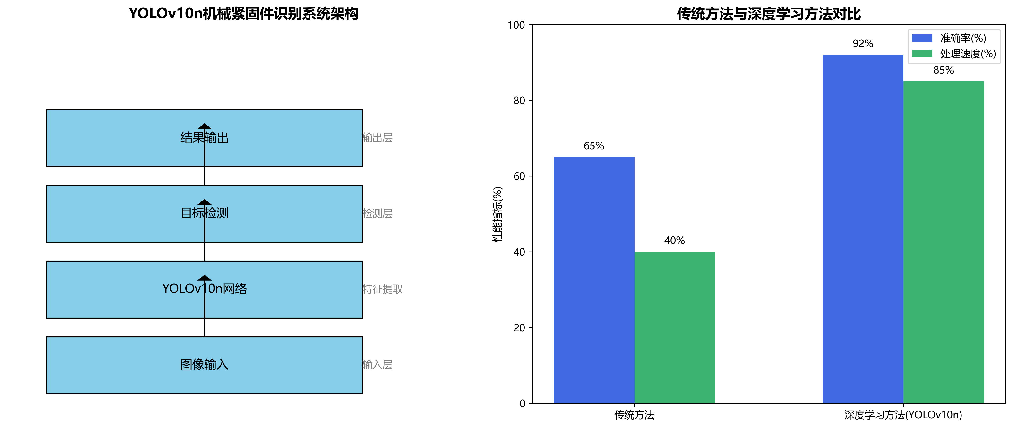 本研究提出了一种基于改进YOLOv10n的机械紧固件智能识别系统,通过引入IFM模块和SimFusion模块优化了特征融合能力,显著提升了模型对螺栓、螺母、螺丝和垫圈的检测精度。实验结果表明,改进后的算法在自建数据集上mAP@0.5达到0.9237,同时保持较高的检测速度,满足工业实时检测需求。