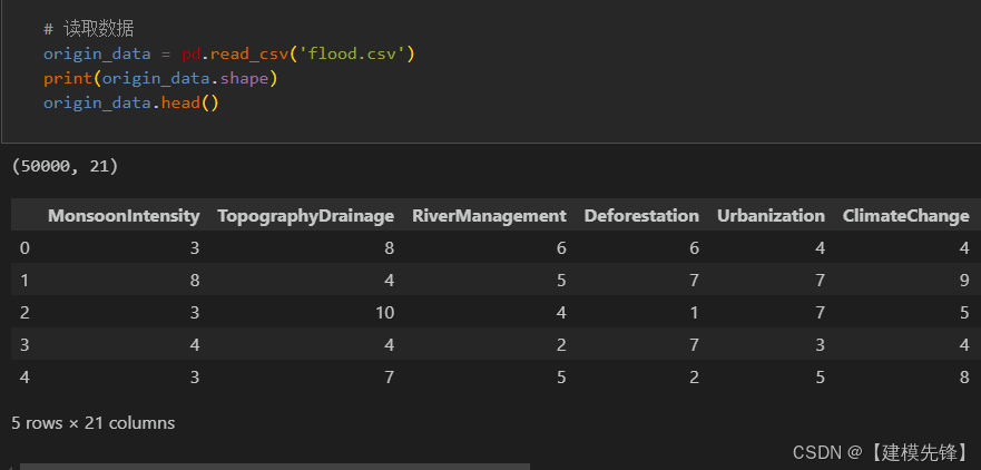 数据集格式为CSV文件,共50000个样本,20个特征,来预测FloodProbability(洪水概率): 该结果变量基于上述因素预测洪水的可能性,可能表示为0到1之间的概率。