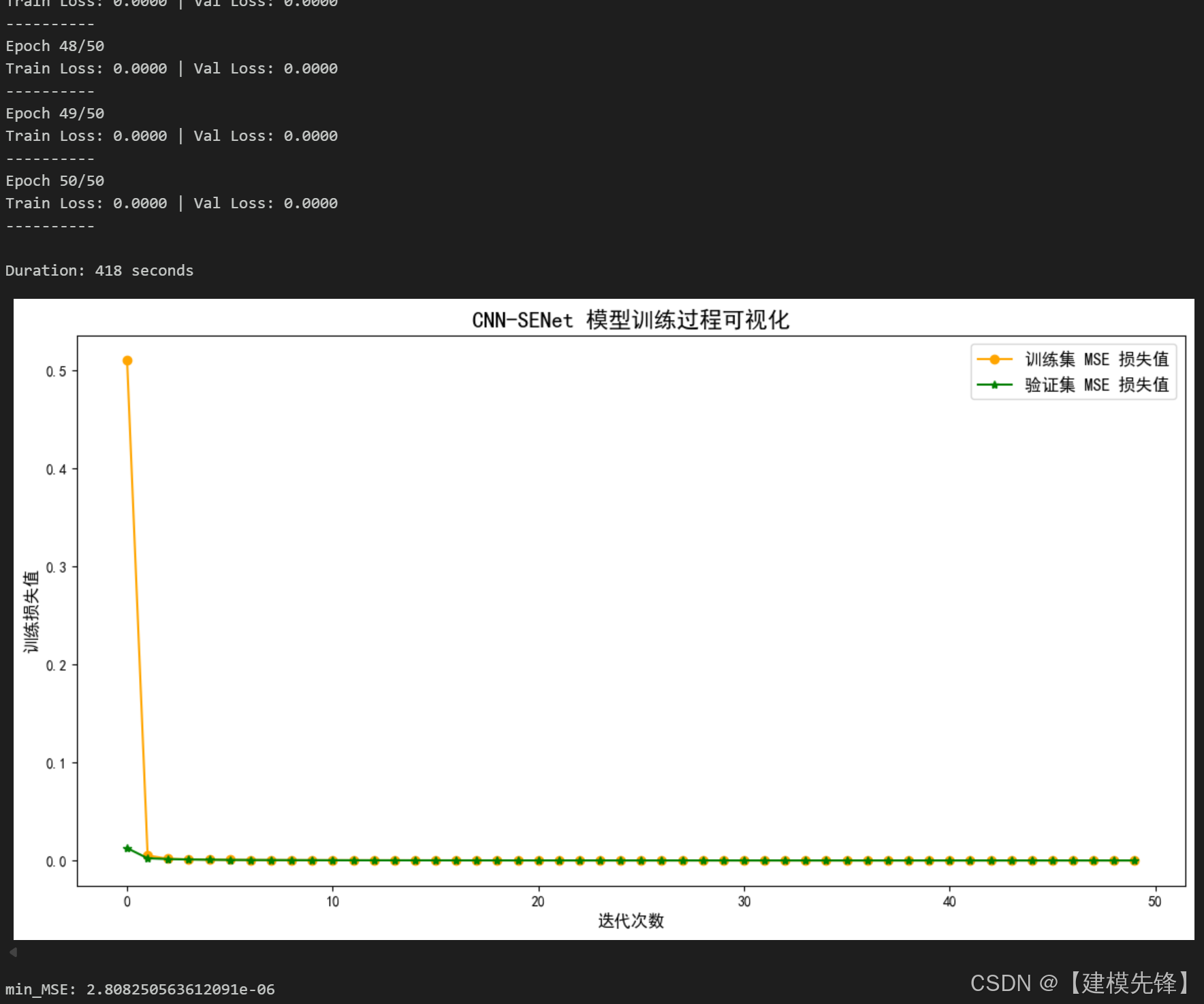 50个epoch,mse极低,CNN-SENet网络效果显著,模型能够充分提取数据的多尺度特征,收敛速度快,性能特别优越,效果明显。
