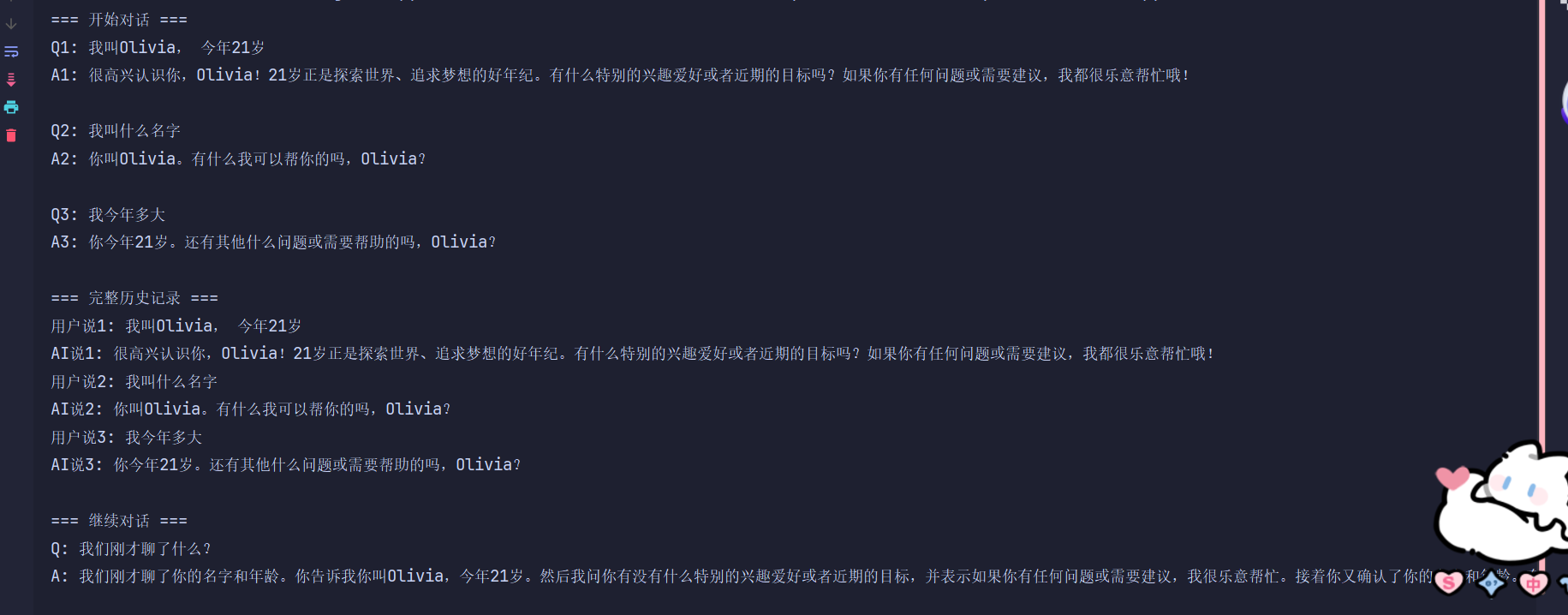 res1 = chain.invoke({"input": "我叫Olivia, 今年21岁"})