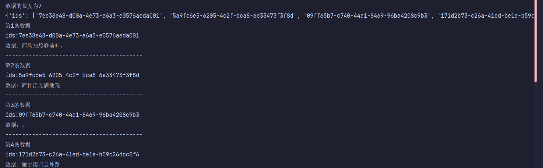 这里发生的事是每一个切割后的 Document.page_content 都会被送进 embedding 模型,而Embedding 模型负责将自然语言映射到向量空间,使得"语义相近"的文本在向量空间中距离更近,(这里我把 embedding 模型单独封装在 ChatModel 里了,这段代码就不展示了),然后接下来就是向量入库的核心: