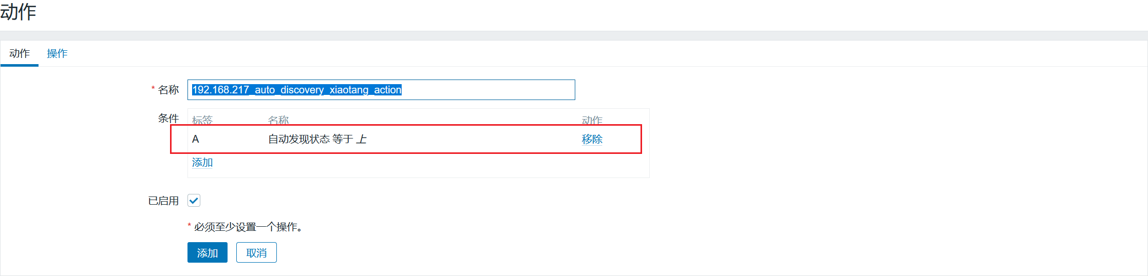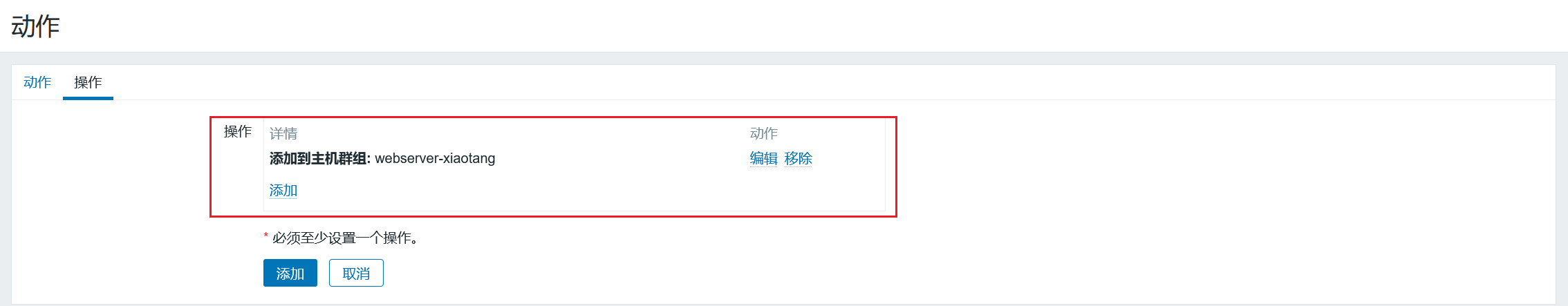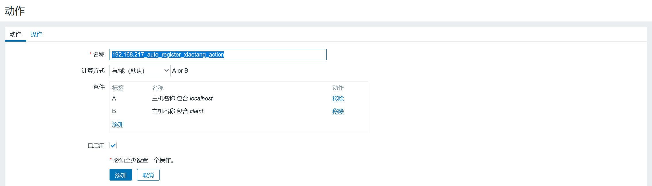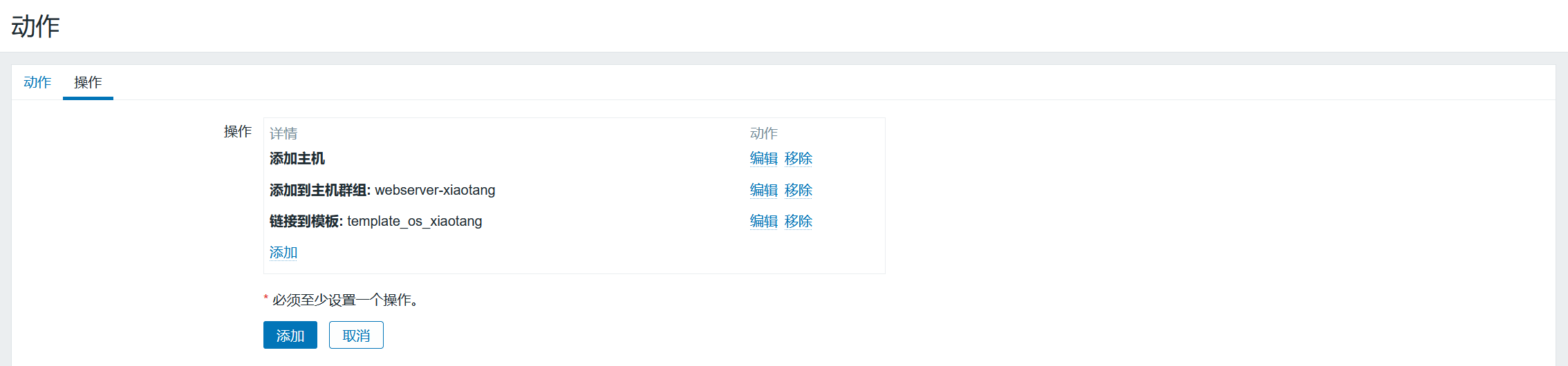 点击->操作配置,选择具体的操作类型:添加主机、添加到主机群组、与模板关联