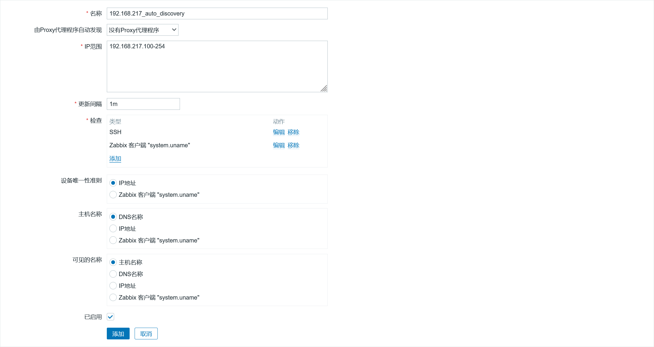 "配置"->"自动发现"->"创建发现规则" 填入名称、需发现服务器、设备的IP范围、更新间隔、检查项(ssh和zabbix客户端)、设备唯一性准则 最后勾选已启用、点击添加。