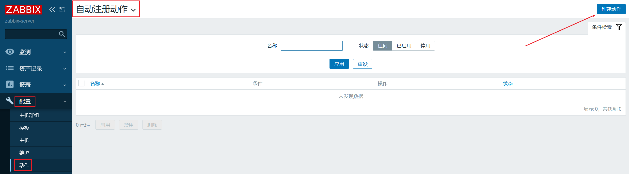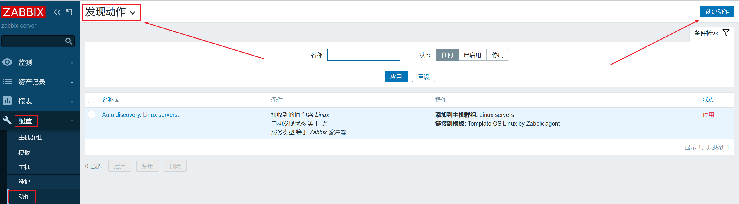 "配置"->"动作"->事件源"自动发现"->"创建动作"