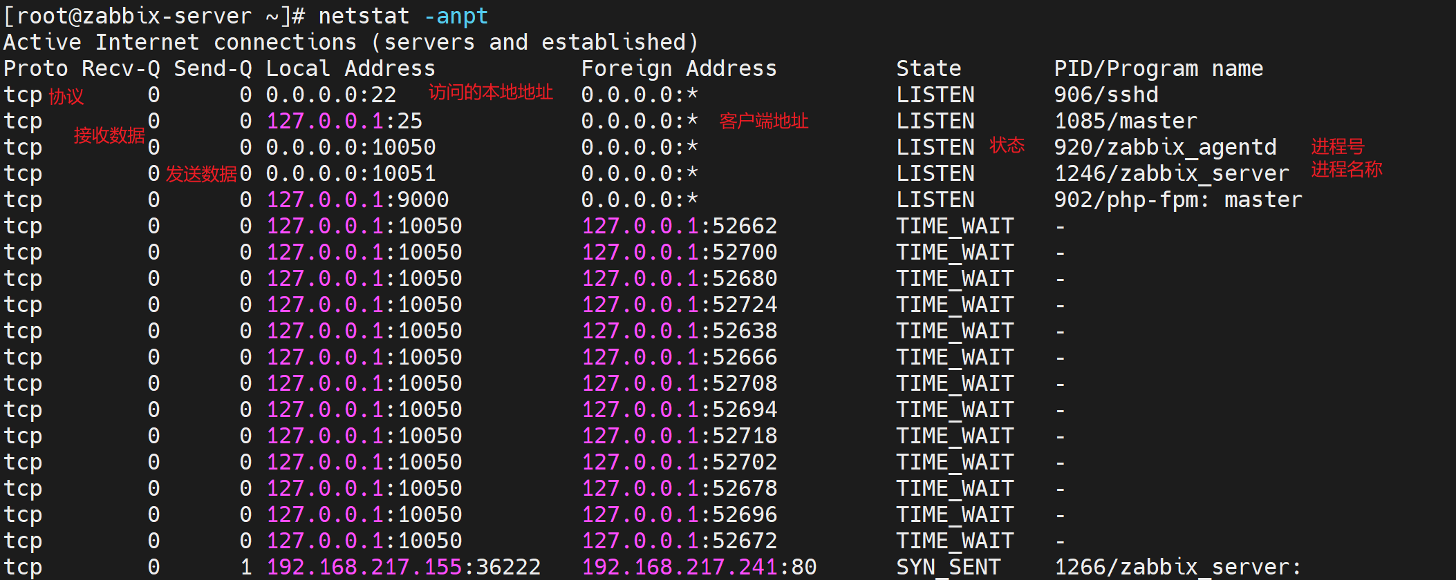 ESTABLISHED : 完成TCP三次握手后,主动连接端进入ESTABLISHED状态。此时,TCP连接已经建立,可以进行通信。