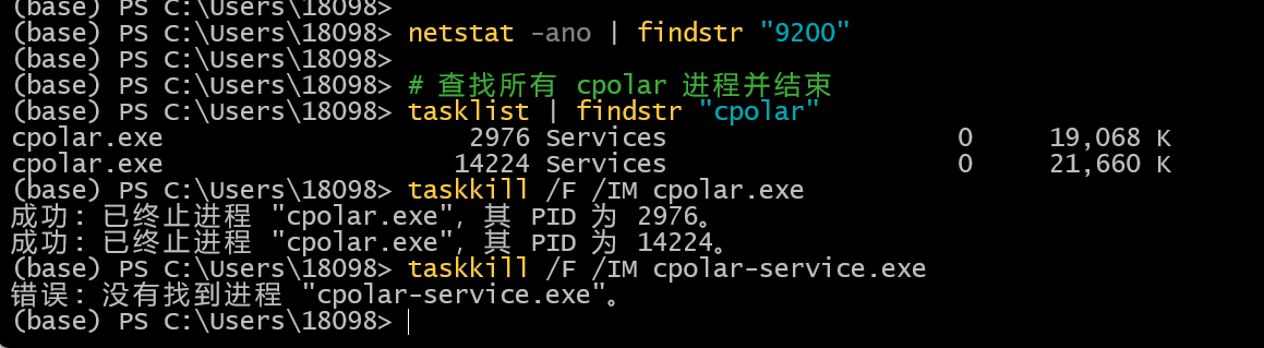 但是,这个过程如果多次重启服务但是cpolar.yml配置文件并未生效(如果重启服务后可以正常访问9250端口来登录那就不用这个步骤了!),那就打开任务管理器将所有关于cpolar的进程直接关闭掉,同时打开管理员终端关闭掉所有原来9200的端口,强制杀死即可。(还有就是低版本可能不支持这个参数,实在不行就别操作了)