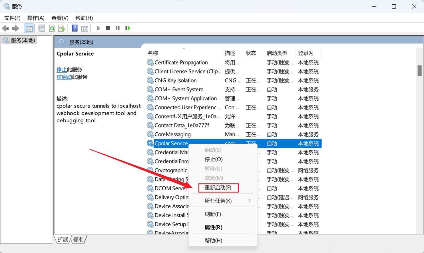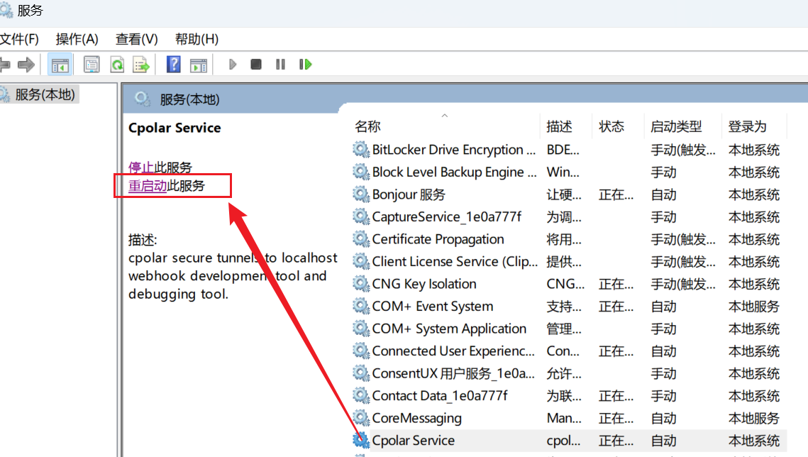 - windows系统:在控制面板--管理工具---服务---cpolar service,重启服务。