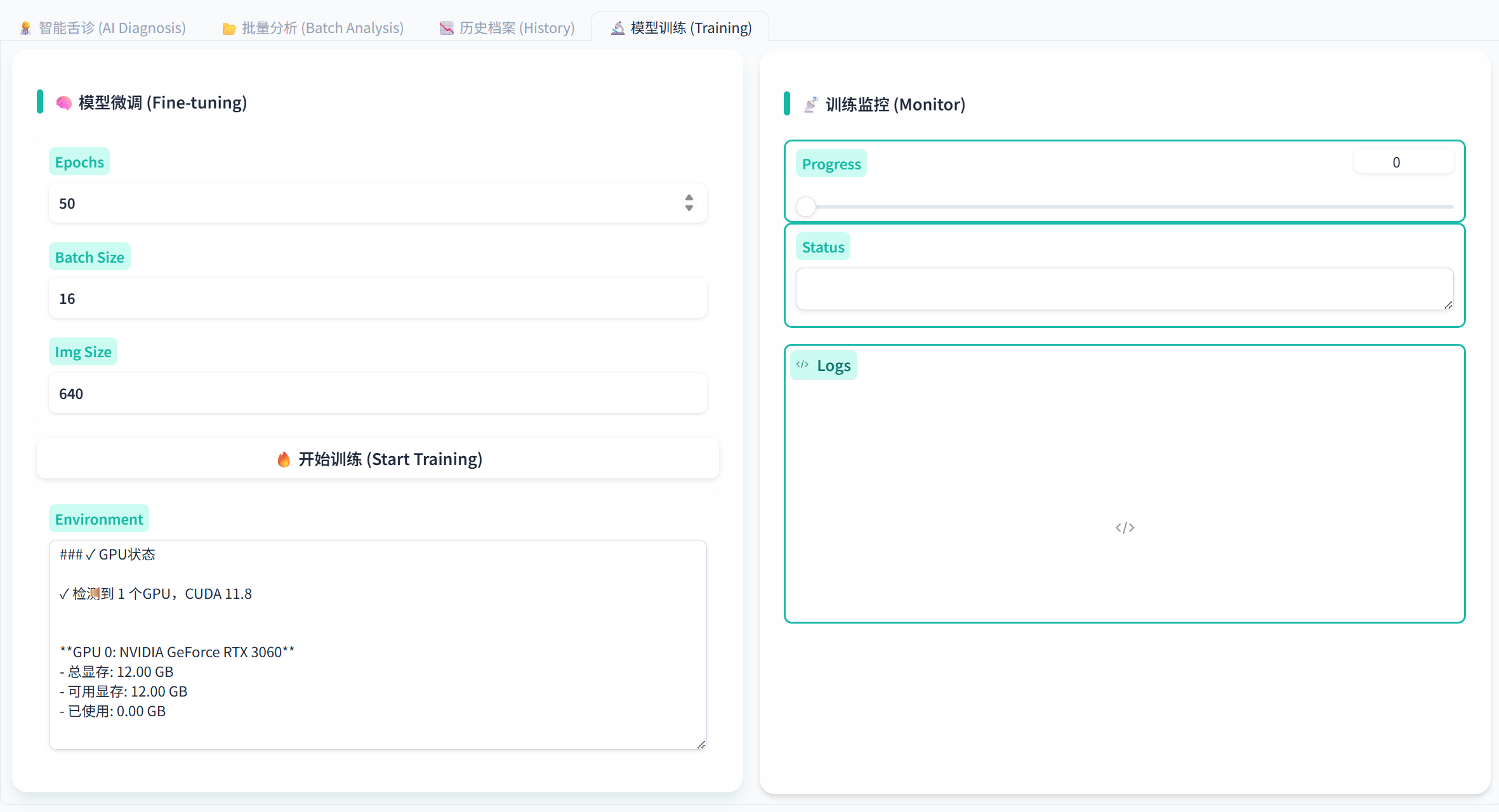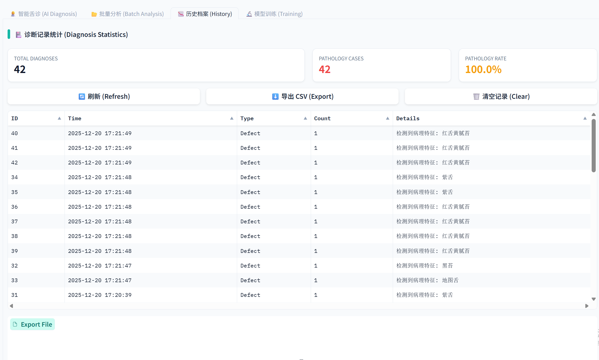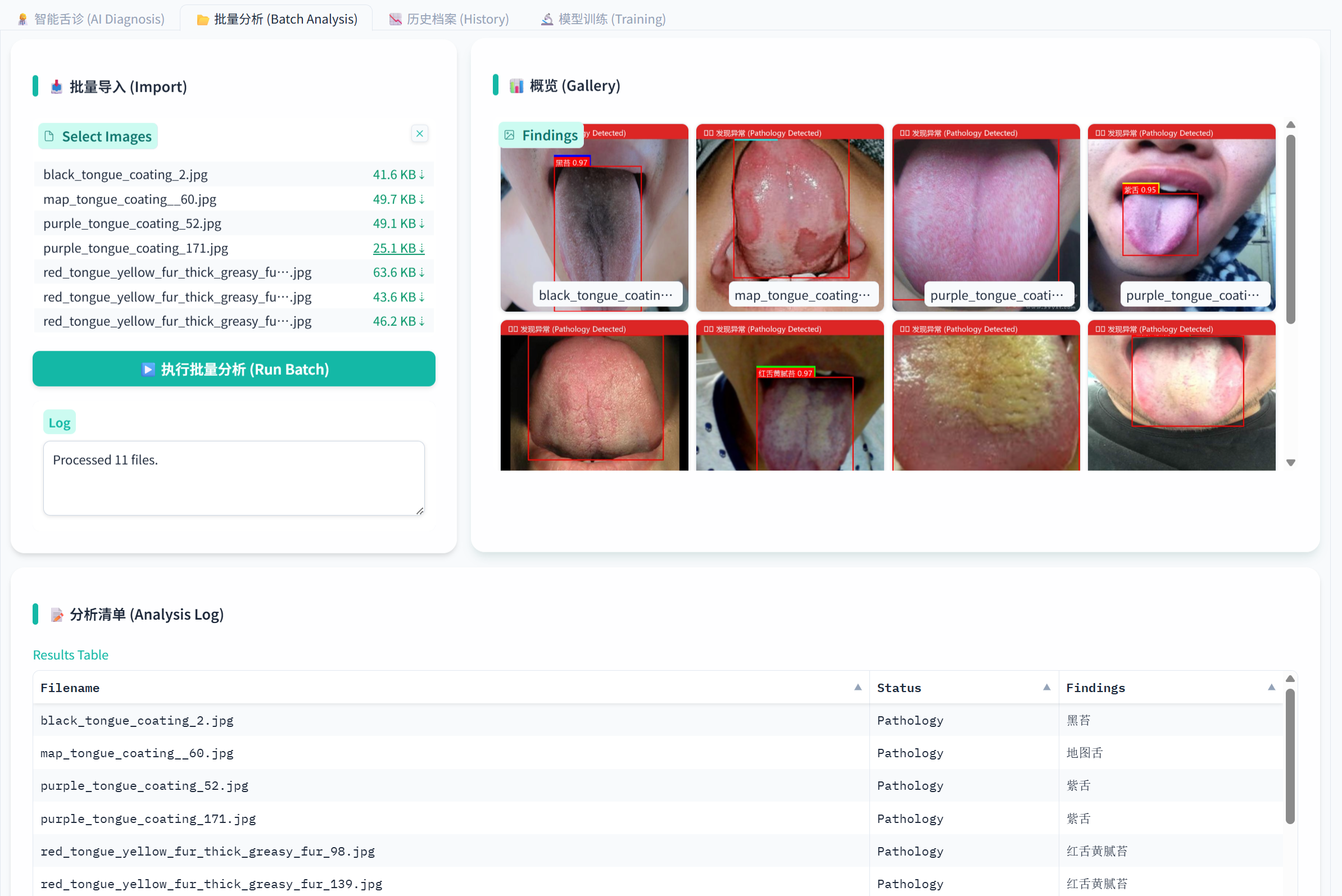 - 高通量自动筛查 :支持由文件夹批量导入舌象图片,系统自动进行检测与分析,并生成包含文件名、检测结果、病理计数的 Excel/CSV 报表。
