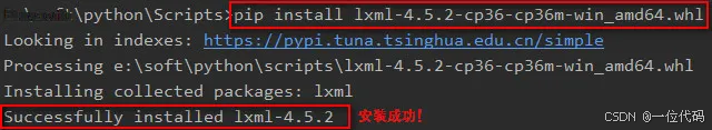 注:上面举例中,直接将whl格式文件复制到了Scripts文件目录下,所以完整命令直接是:pip install lxml-4.5.2-cp36-cp36m-win_amd64.whl。根据自己whl文件路径做修改,如放在E盘根目录下,命令则变成:pip install E:\lxml-4.5.2-cp36-cp36m-win_amd64.whl