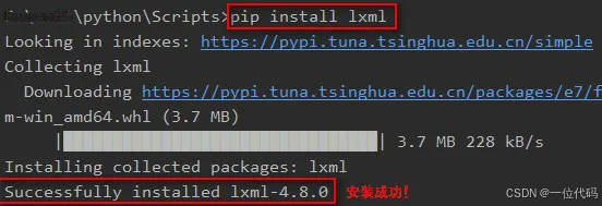 **一是:**最简单直接的 pip 命令安装------pip install lxml。(优先使用)