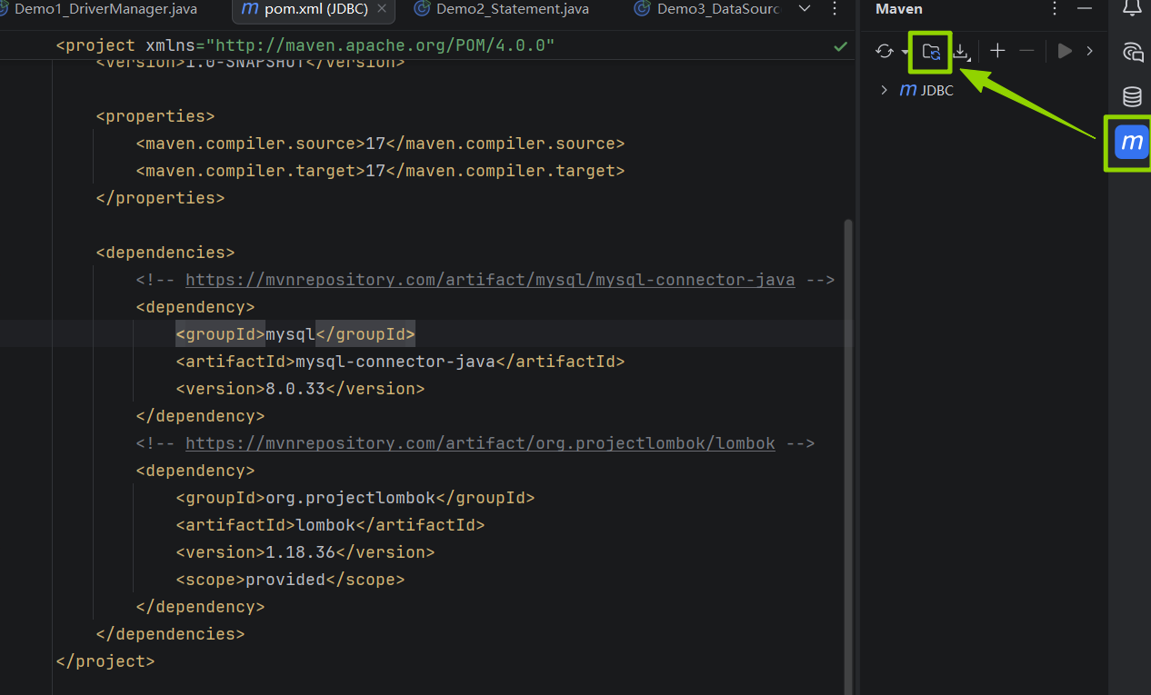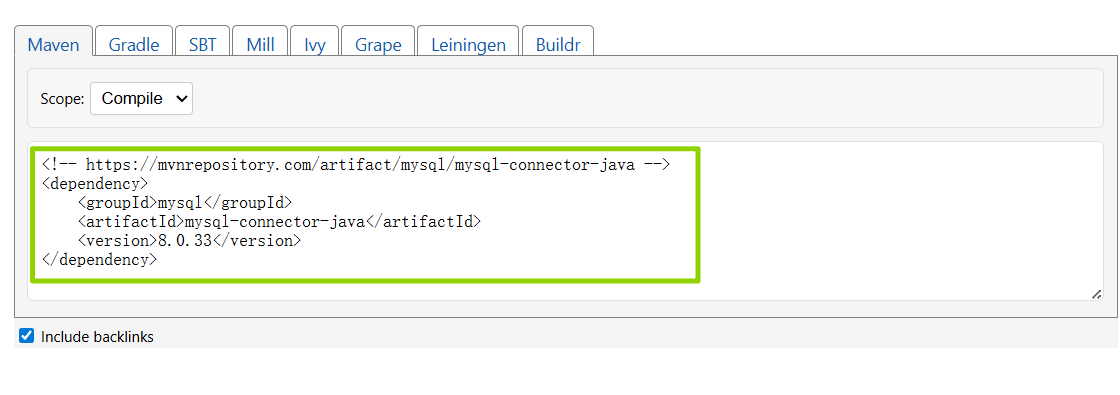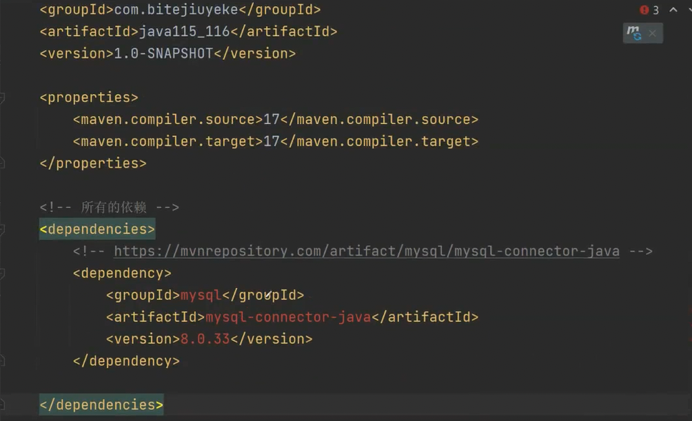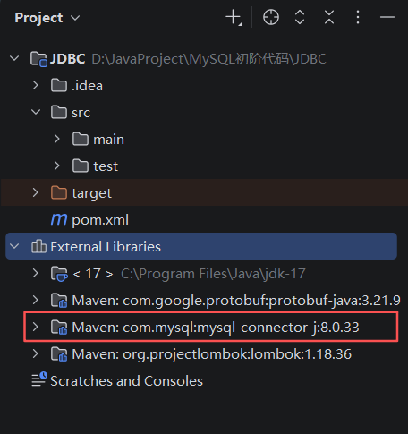 这个com.mysql:mysql-connector-j:8.0.33包就是我们JDBC要用到的驱动包。