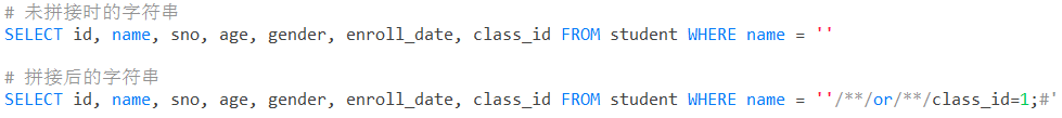 /**/ 和 # 在SQL语法中都表示注释,在这里你可以把它看作一个空格,执行上面拼接后的语句就相当于执行了下面的这条语句:
