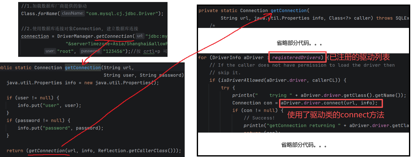 总的来说,DriverManager 会根据 url 来识别我们要连接的是哪一个数据库系统(此处是 MySQL),然后从已注册的驱动列表中找到适配该数据库的驱动类实例 (此处是com.mysql.cj.jdbc.Driver),调用其connect()方法 完成与数据库的物理连接,最终返回代表该连接的Connection对象。